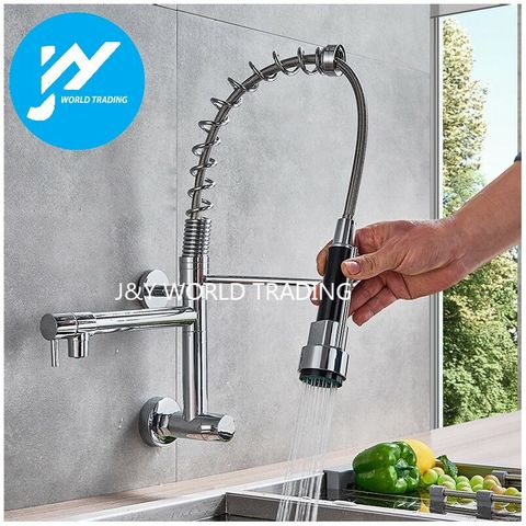 Gold Kitchen Double Faucet Wall Water Tap SUS 304 Stainless Steel Premium Quality 金横式双大弯水龙头