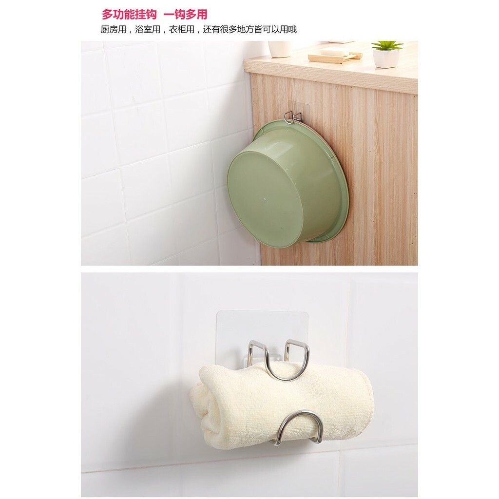 This adhesive hook is suitable for hanging all kinds of washbasin, vegetable basin, robe, bags, calendar, bath towels, coat, towels, keys, hats, scarves in your home, kitchen or bathroom. Use on flat surfaces such as wall, tile, iron, or smooth wood board.